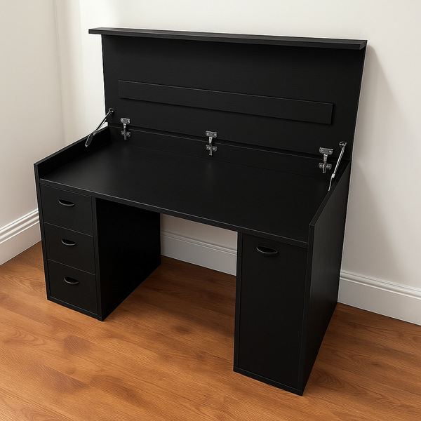 O design inclui um prático gaveteiro integrado com 3 gavetas para manter itens menores organizados e à mão. Do outro lado, a Workstation oferece um gabinete fechado por porta, ideal para guardar itens maiores ou, especialmente, acomodar a CPU do seu computador. Pensando na versatilidade e na ventilação, este gabinete conta com duas prateleiras internas removíveis, permitindo ajustar o espaço conforme sua necessidade ou criar um vão livre para a CPU. Para garantir a ventilação adequada do equipamento, o fundo deste gabinete também é removível, um detalhe inteligente que protege seu equipamento e mantém a organização. Um box elevado no topo (com 15cm de altura) completa o design, perfeito para acomodar monitores, luminárias ou itens decorativos, mantendo a superfície principal livre. O vão para as pernas tem confortáveis 70cm de largura. A altura total da Workstation é de 90cm.